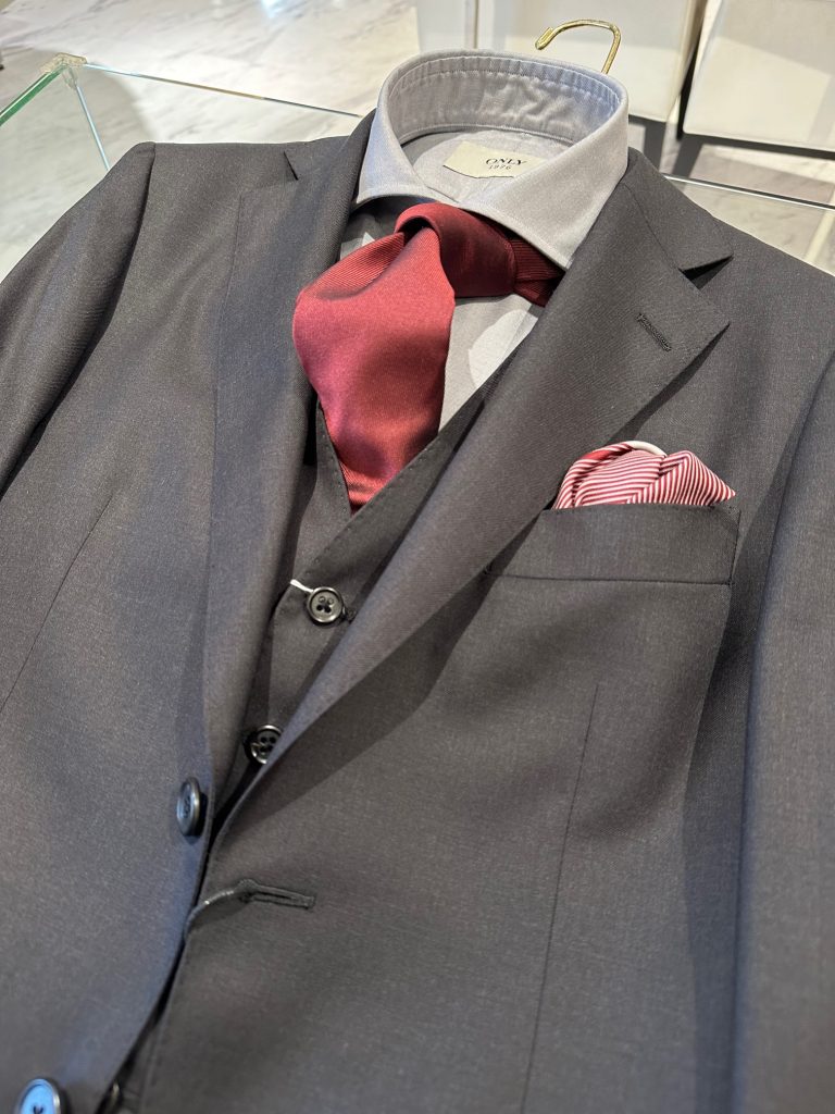 次はスーツ、シャツを同色のグレーでまとめてアクセントとしてレッドのソリッドタイとチーフを取り入れてみました!