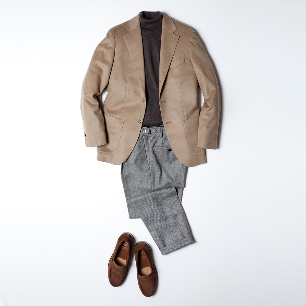キャメルカラーにグレーで濃淡をつけたコーディネートはまさに大人そのもの。