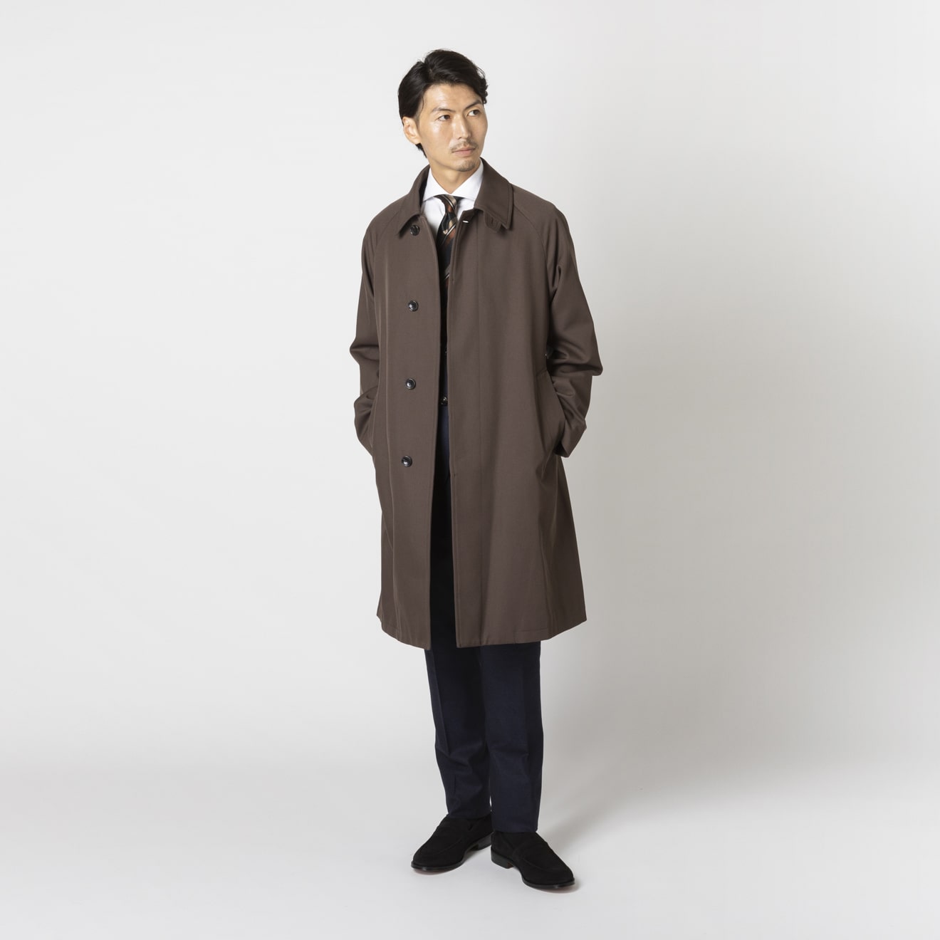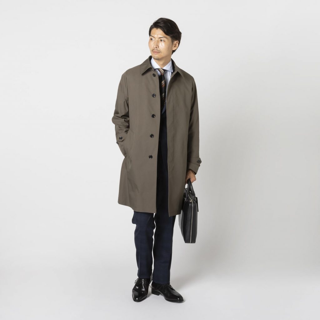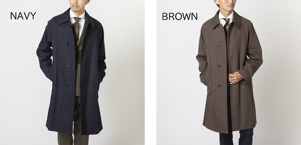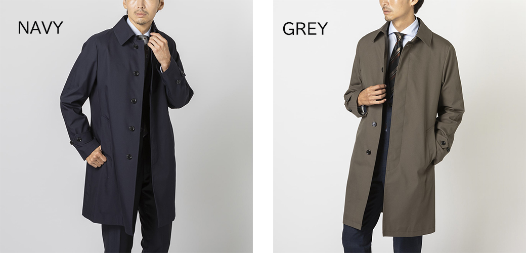定番ネイビーは幅広いビジネスシーンに対応し、一見カーキにも見えるニュアンスカラーのグレーは、タイドアップしたスーツの上はもちろん、キレイ目カジュアルなコーディネートにも合わせやすい仕上がりです。