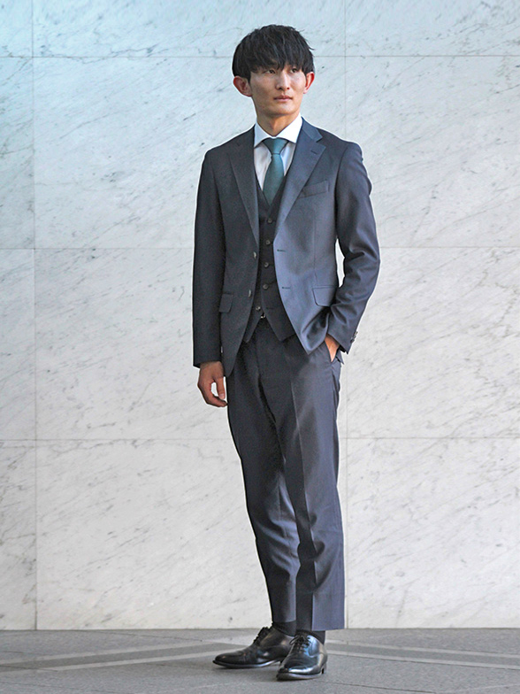 S.M.様取引先との商談などで着用できればと思いベスト付きで仕立てました。ニュアンスカラーと光沢感が綺麗な生地で、ボタンも色付きの水牛釦を選んでみました。生地はこちら