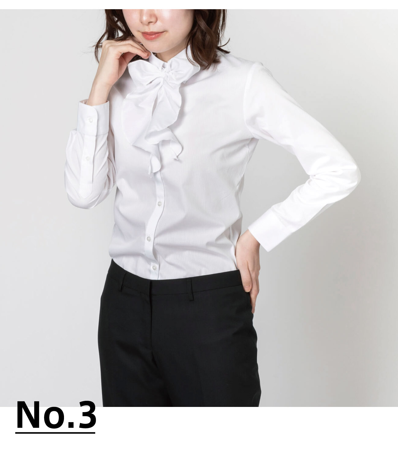 首元にエレガントな印象を与える、フリルデザインを取り入れたシャツ。