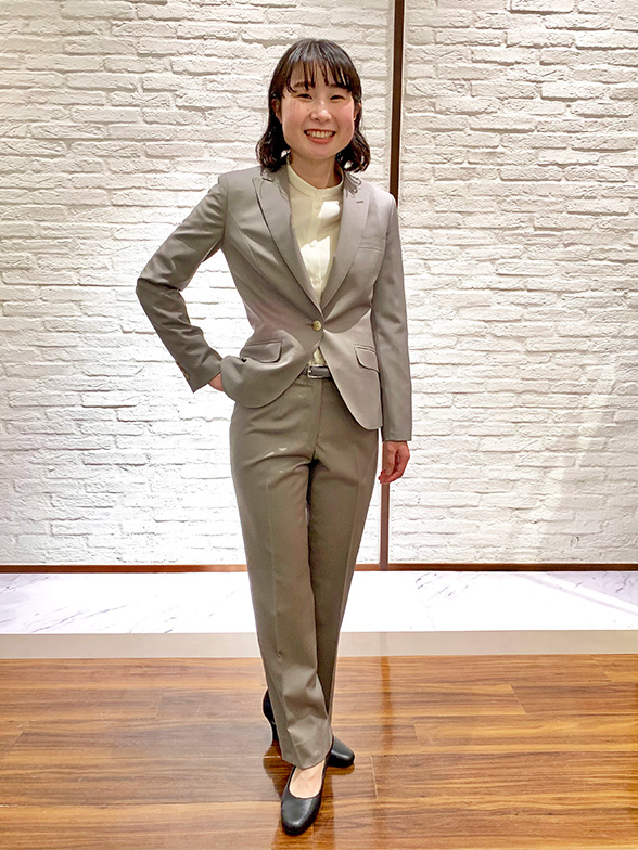M.M.様女性のスーツにかっこよさを求めてオーダーしてみました。明るいライトグレーは春にピッタリ!お仕事するのが楽しくなりそうです!