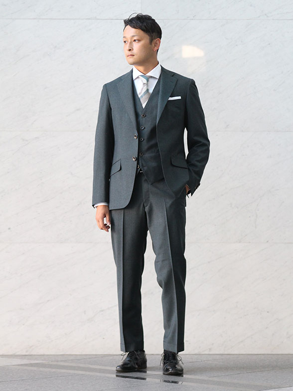 K.N.様営業職で毎日スーツを着ております。シュッと見える点でオーダースーツを選びました。見栄えさることながらとシワになりにくいなど機能性も充実している点からいつもカッコイイ雰囲気でありたいです!生地はこちら