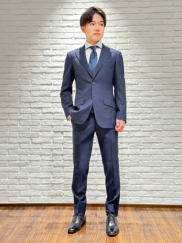 T.H.様ベーシックかつ様々なシーンで重宝できる一着としてネイビーの無地を選んで頂きました。インポートならではの光沢感により好印象を与えてくれます。自分の体形に合った1着が仕上がり大満足です!生地はこちら