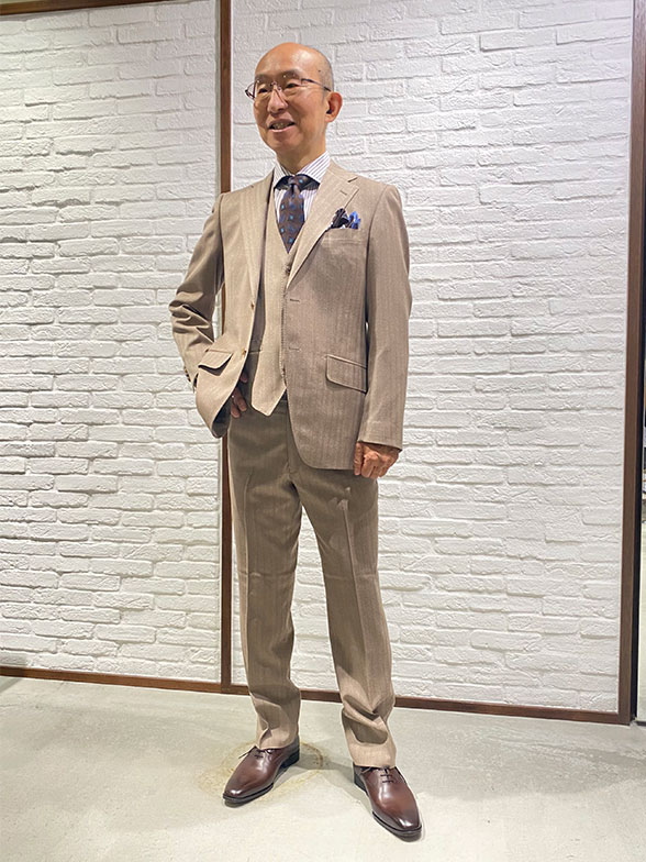 H.A.様講演会・スピーチ用とのことで洒落感のあるベージュをセレクト。3ピーススーツで仕立てることでドレス感を保たせながら、色気を演出できます。生地はこちら