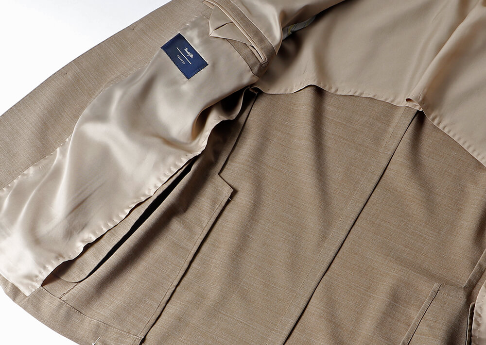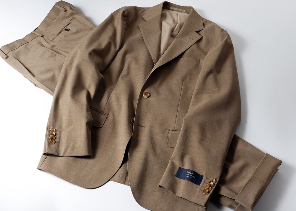 洒落っ気たっぷりな色味のベージュスーツ。軽やかさや清涼感、さらにはリッチな印象も併せ持ち、シャレ者感を漂わせたワンランク上のスーツスタイルに仕上がること間違いなし。