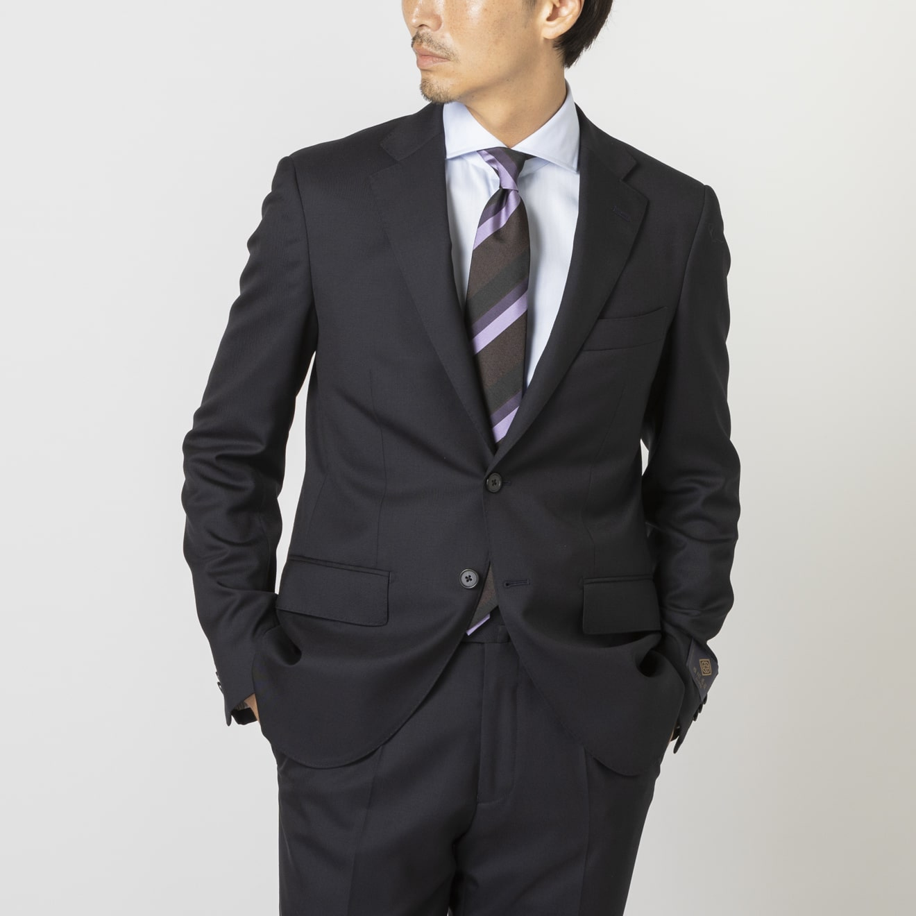 ビジネスから結婚式や成人式までシーンや世代を問わず着用できる万能無地スーツとして好評。