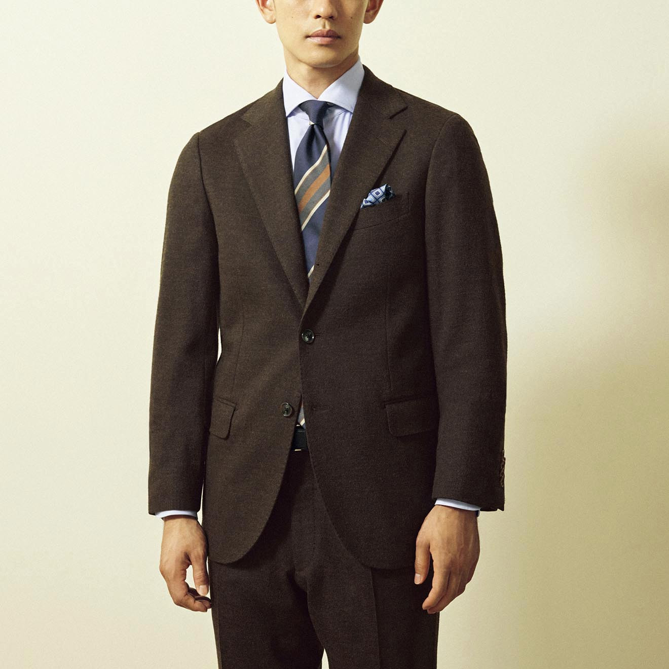 秋冬はカノニコ社のウールサキソニーを用い、温かみとリラックス感を兼備する一着に仕上げました。