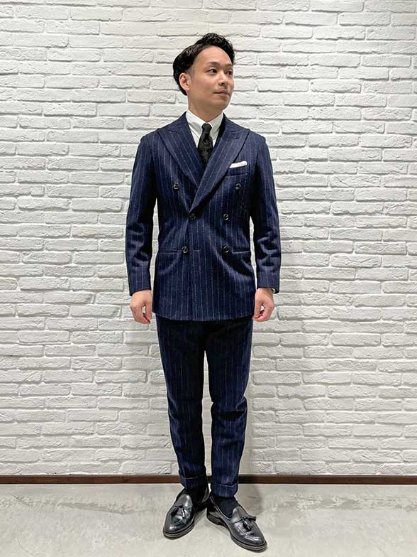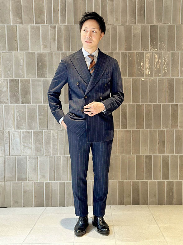 メリノジャージーのダブルブレステッドは、今季初めての展開。ビジネスに最適なネイビー地のチョークストライプ。いざという時のプレゼンや会議、頼りがいのある自分を表現したいときにもおすすめです。