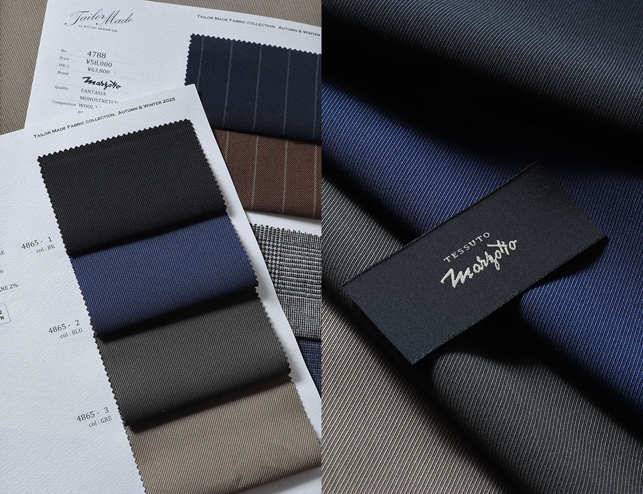1836年創業、イタリア屈指の老舗繊維メーカーであるマルゾットは、クラシックでありながら現代的な感性を併せ持つ、バランスのとれた生地づくりに定評があります。しっかりとした打ち込みによる耐久性と、控えめながらも品格ある光沢感が特徴。実用性と洒落感を兼ね備えたブランドです。