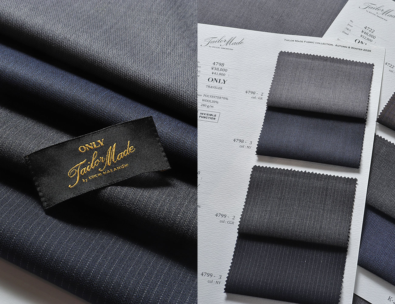 「ウール100%から機能を付加したものまでご用意。38,000円の生地は全て『トラベラー』シリーズのため、出張や消耗が激しい方にもおすすめできます。」
