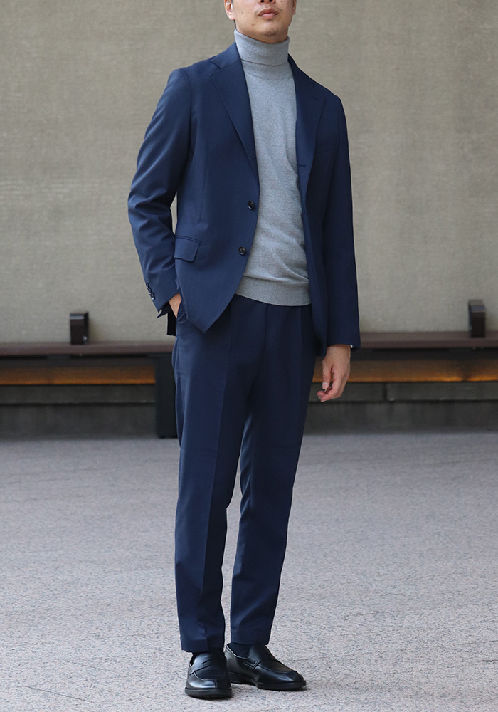 インナーをニットに替えれば、ほどよくリラックスした印象に。イタリア製のタートルネックの風合いを活かすことで、オフィスワークやオフタイムにもぴったりの抜け感が生まれます。