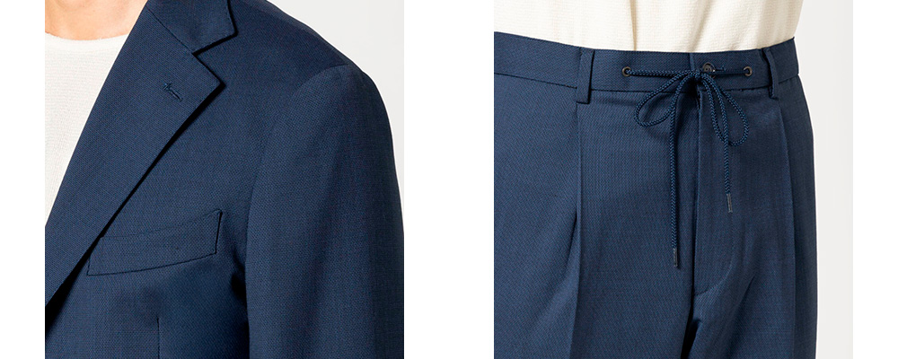 大事なミーティングでも、オフィスワーキングでも、テーラー仕立ての立体感はそのままに、パンツはベルトでもドローコードでも使える2WAY仕様。