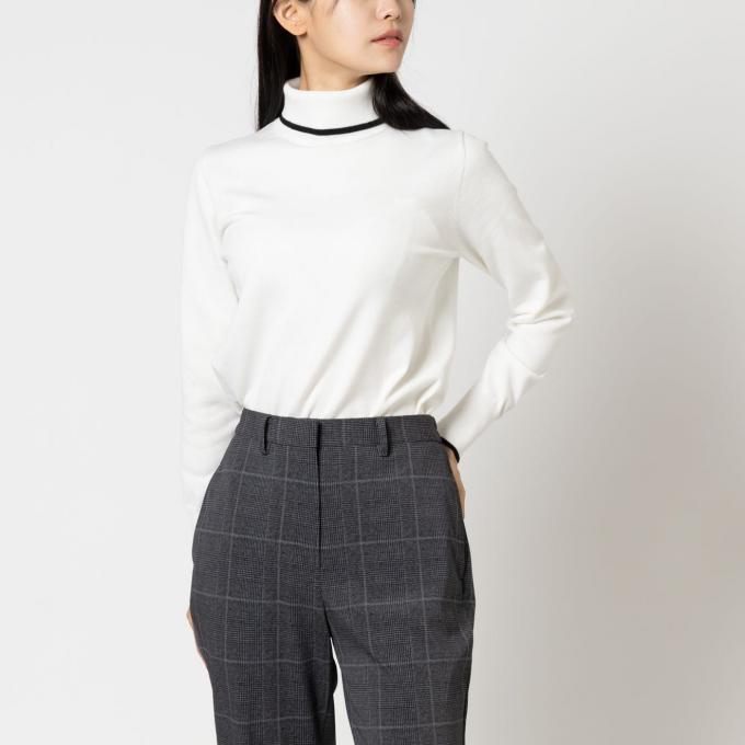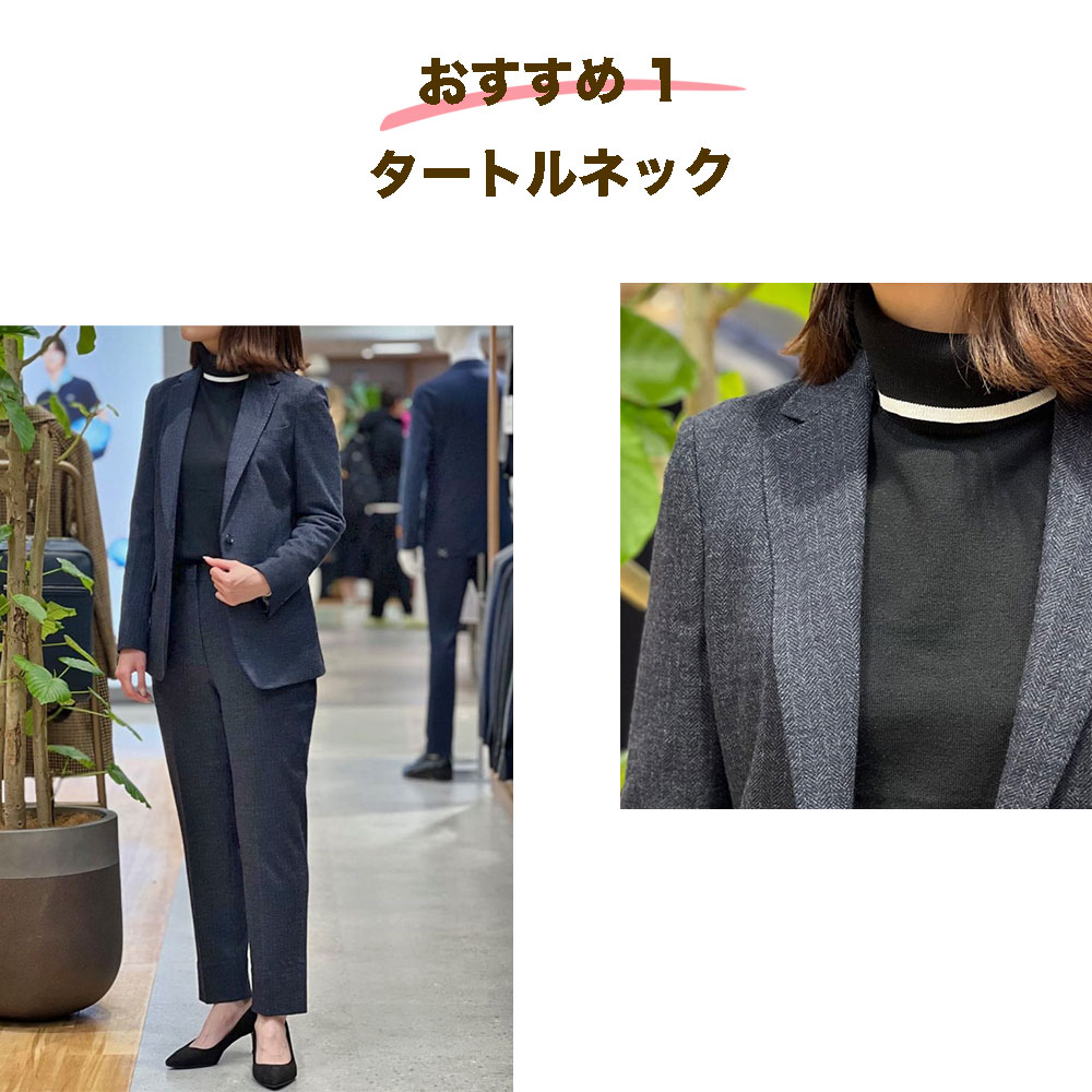 首元をすっきりと見せるタートルネックは、冬の通勤服の最強の味方。ブラックを選べば、ジャケットのシルエットが引き立ち、“きちんと感”と“シャープさ”を両立した装いに。忙しい朝も、この一枚で自然と整うスタイリング。