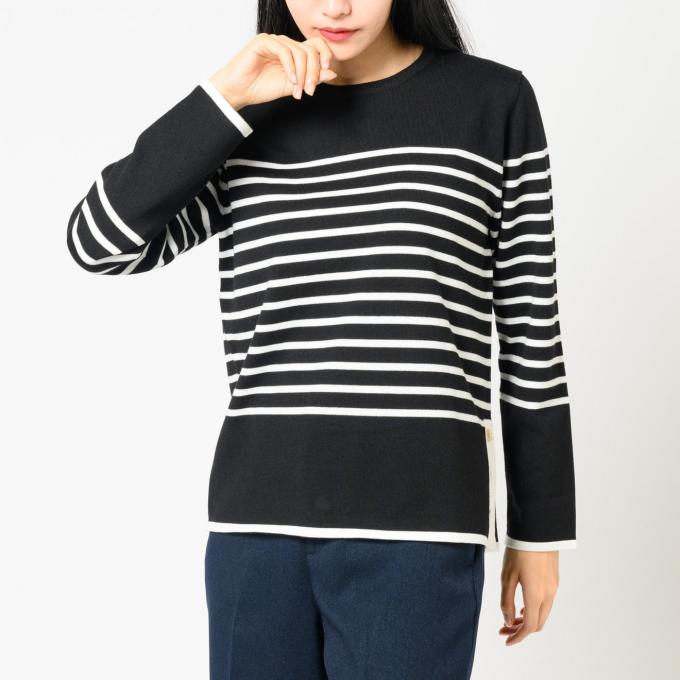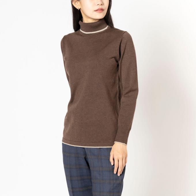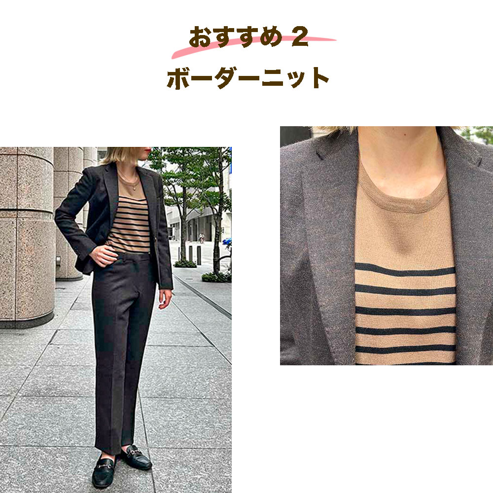 無地のインナーに飽きたら、細ボーダーでさりげない遊び心を。スーツに合わせてもカジュアルになりすぎず、大人の余裕を感じる“抜け感”がつくれる一枚。ブラウン×ブラックの落ち着いた配色は、冬の通勤にも自然になじむバランス。