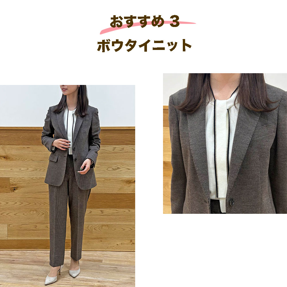やわらかな素材と細身のボウタイで、フェミニンになりすぎず上品にまとまる一枚。ジャケットを羽織っても首元に立体感が残るため、オンライン会議や商談の日にも活躍。かっちりしすぎないきれいさが大人の女性にちょうどいい。