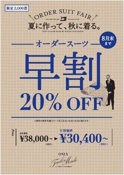 2018 年7月 1 日(日)より、自社のオーダースーツブランド「テーラーメイド」において、厳選した2018年秋冬最新生地コレクションからスーツを20%OFFの価格でオーダーできる「早割」キャンペーンを、全国の「ONLY」、「ONLY PREMIO」、「ONLY WOMEN」、「ONLY京都TAILOR」 で開催いたします。生地やデザイン、ディテールにこだわったテーラークオリティの上質なス...