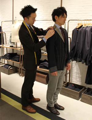 オーダーの特徴である、「型紙おこし」「仮縫い」「フィッティング」「補正しながらの中縫い」「本縫い」という工程をわかりやすくシステム化。仮縫いをその場で体験して頂けるくらいリアルなものにしたいという想いから誕生したのがこのゲージ服です。