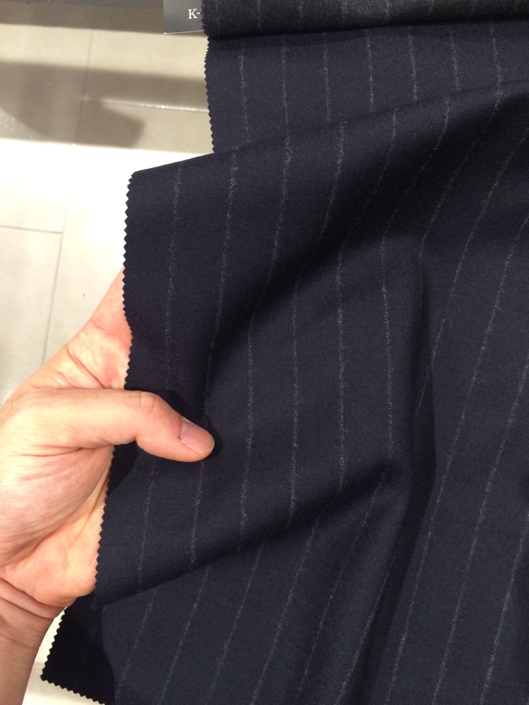 REDA社、起毛したサキソニー生地でピッチ幅太めのチョークストライプ。