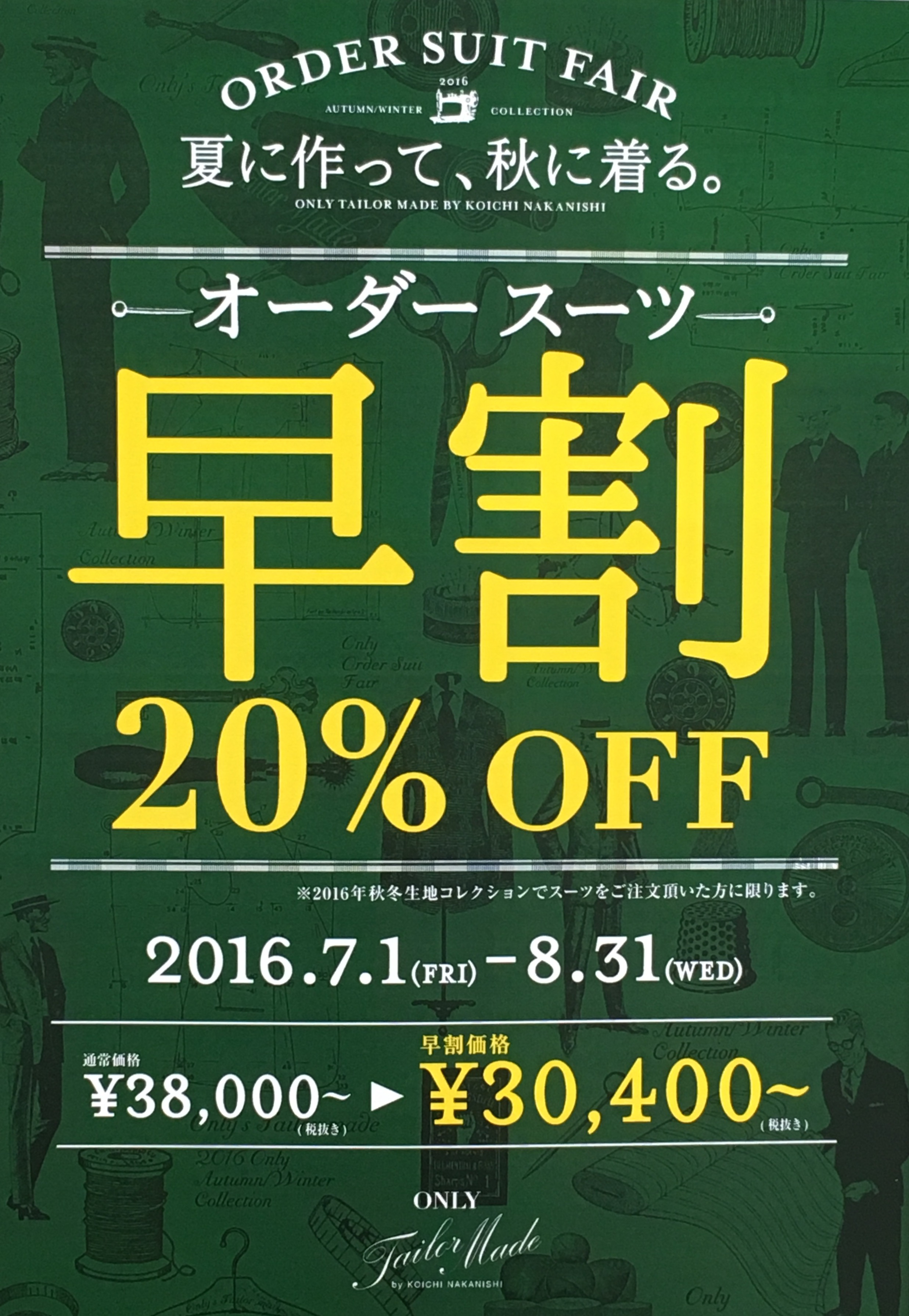 納期は2カ月程、頂く代わりに生地代から20%OFFでお仕立て頂ける大変お得な期間です!