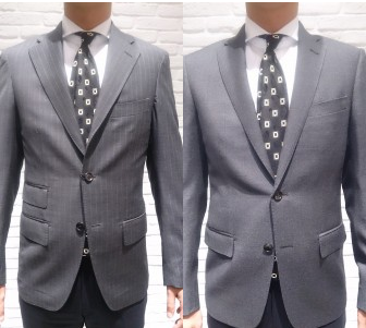 約8㎝幅のラペルに段返り3つボタン、着丈が長めのクラシカルなモデルです。