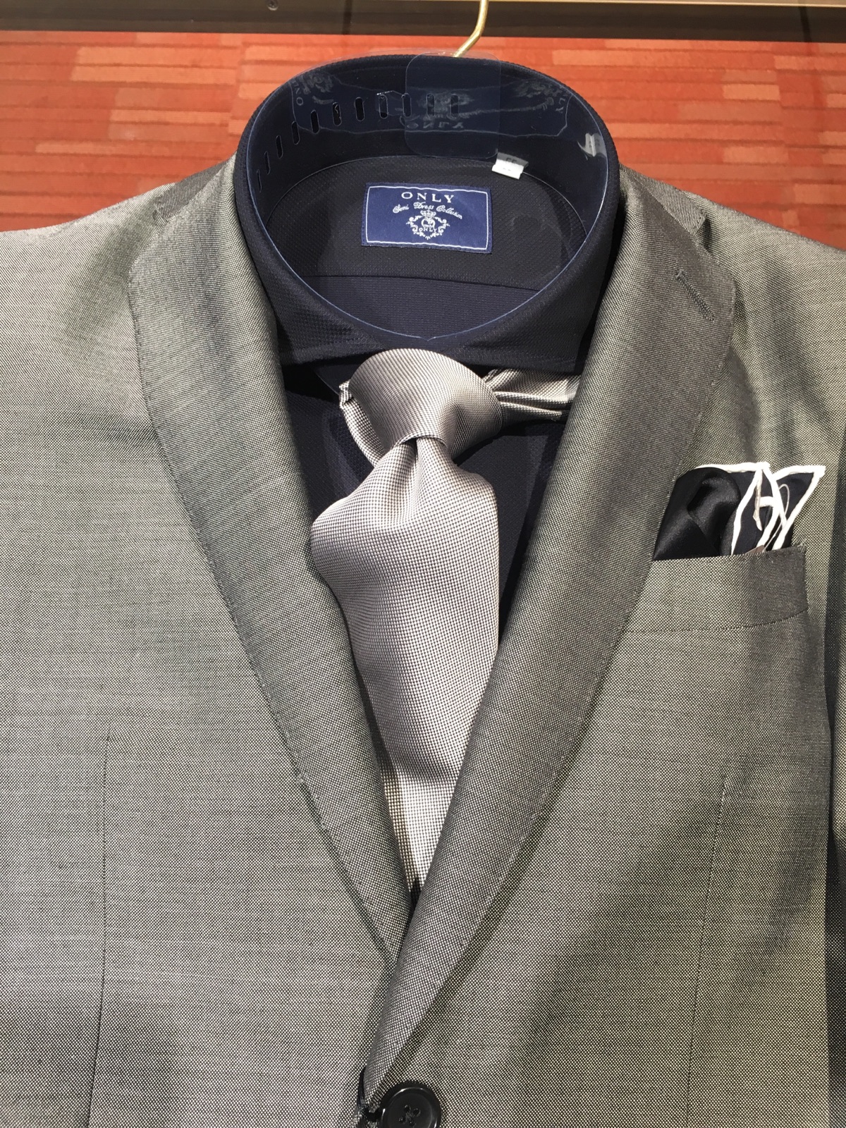非常に明るいグレーですので、シャツはダークにし、ネクタイはシルバーがお勧め。