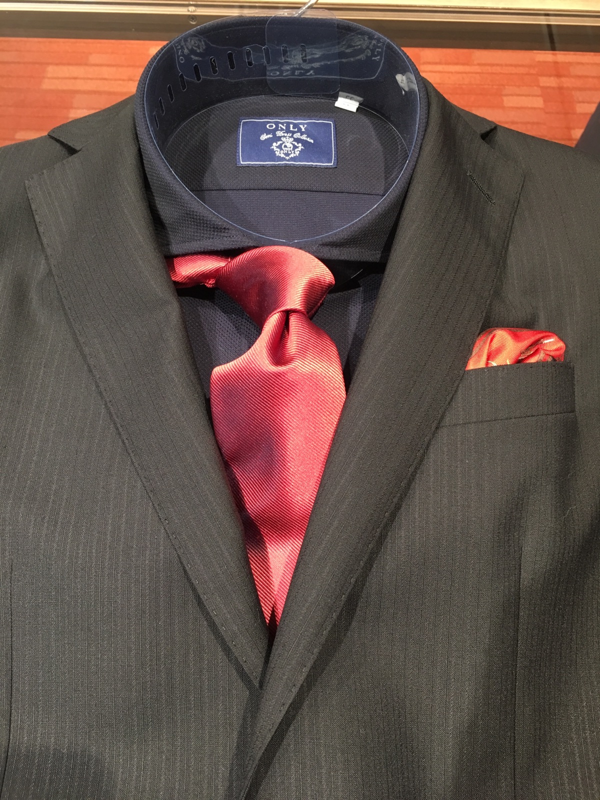 もう1パターンは先程と同じ深いネイビーのシャツに赤のネクタイ、もちろん胸には赤いチーフを挿して下さい。