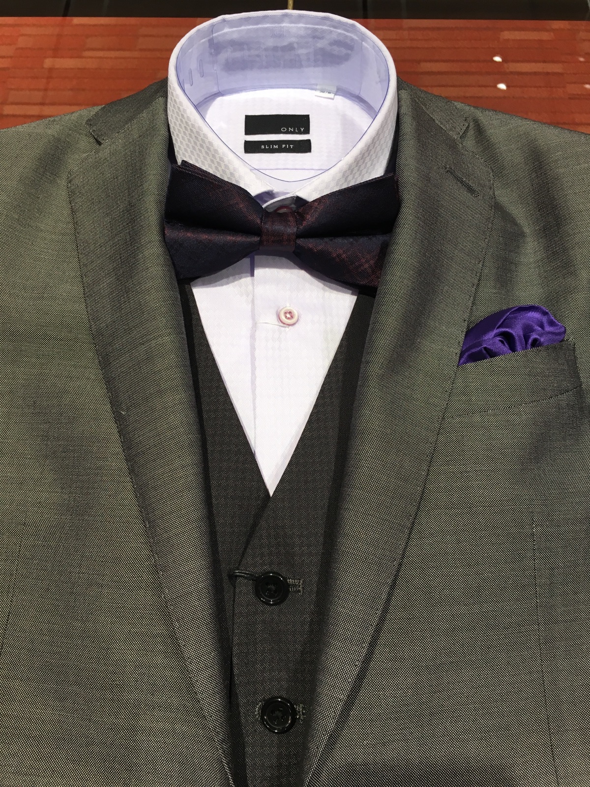 こちらはセレモニー感を活かし、Cグレーのハウンドトゥース(千鳥)ベスト+ラヴェンダーカラーシャツ+ディープパープルの蝶ネクタイです。