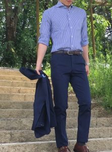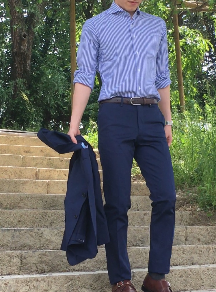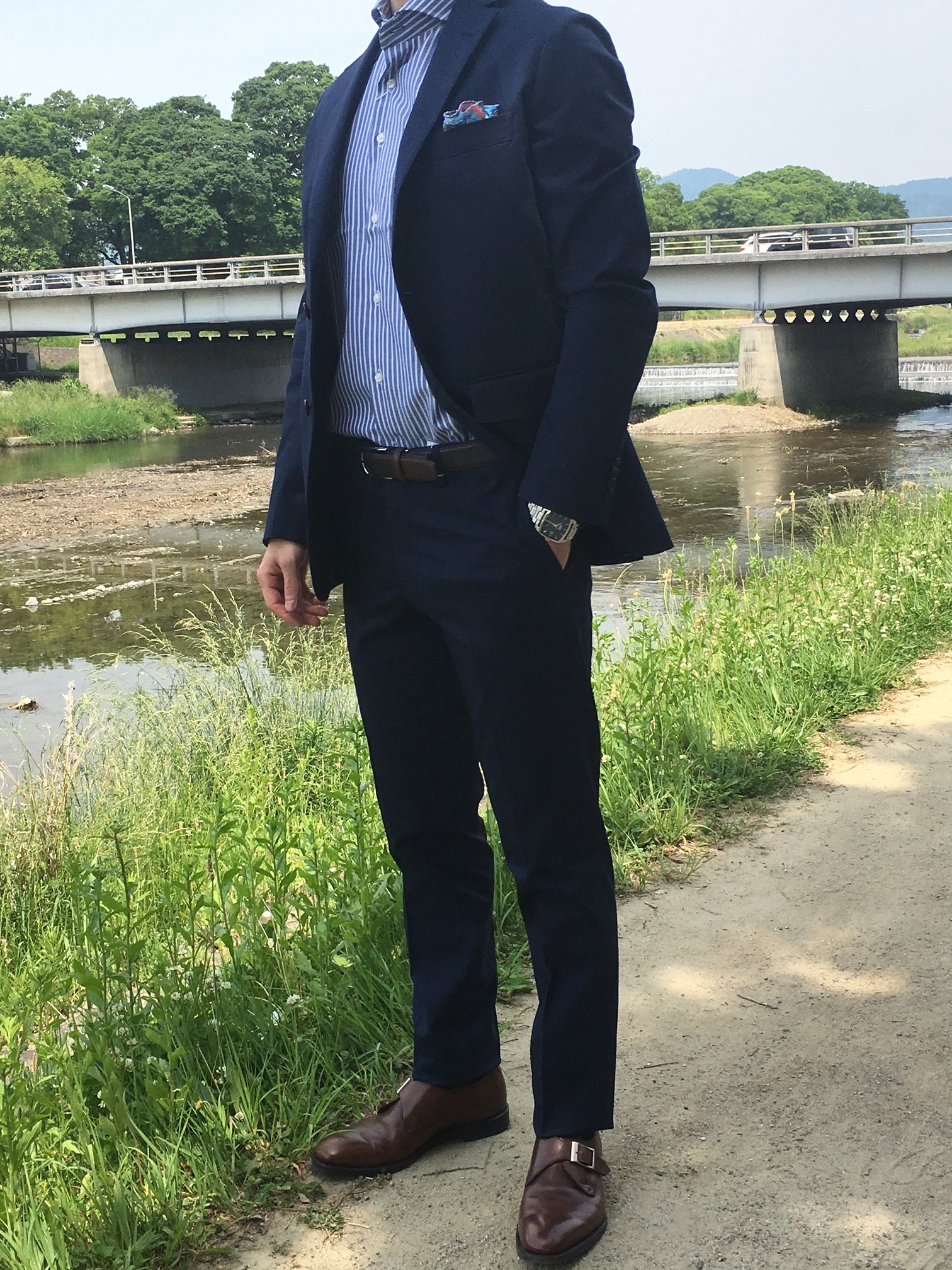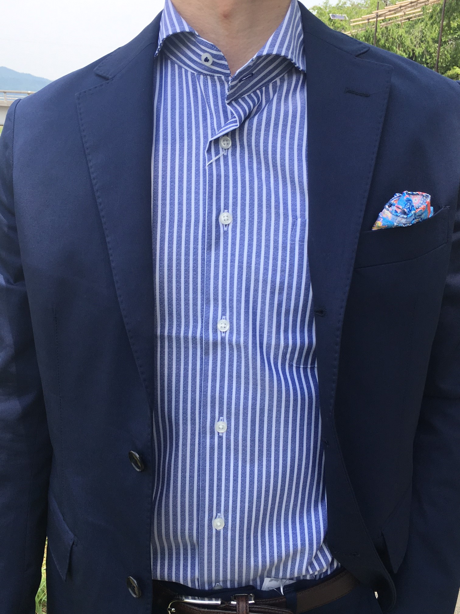 コーディネートに使用したシャツとチーフもブルーでまとめました!スッキリとした印象に。