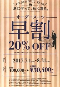 それと「早割20%OFF」も絶好調ですので、スーツの形やボタン、裏地、本切羽、チェンジポケットなどなど、「世界に1着のONLY ONEスーツ」を作りたい方は、こちらをご利用下さいね!