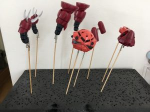 *手にかからないように竹串を持って、缶スプレーは部品から20㎝ほど離し、1箇所に集中してかからないように左から右にスプレーを移動させながら吹き付けます。