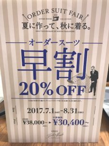 秋冬のスーツを20%でお作り頂ける早割を実施中です。