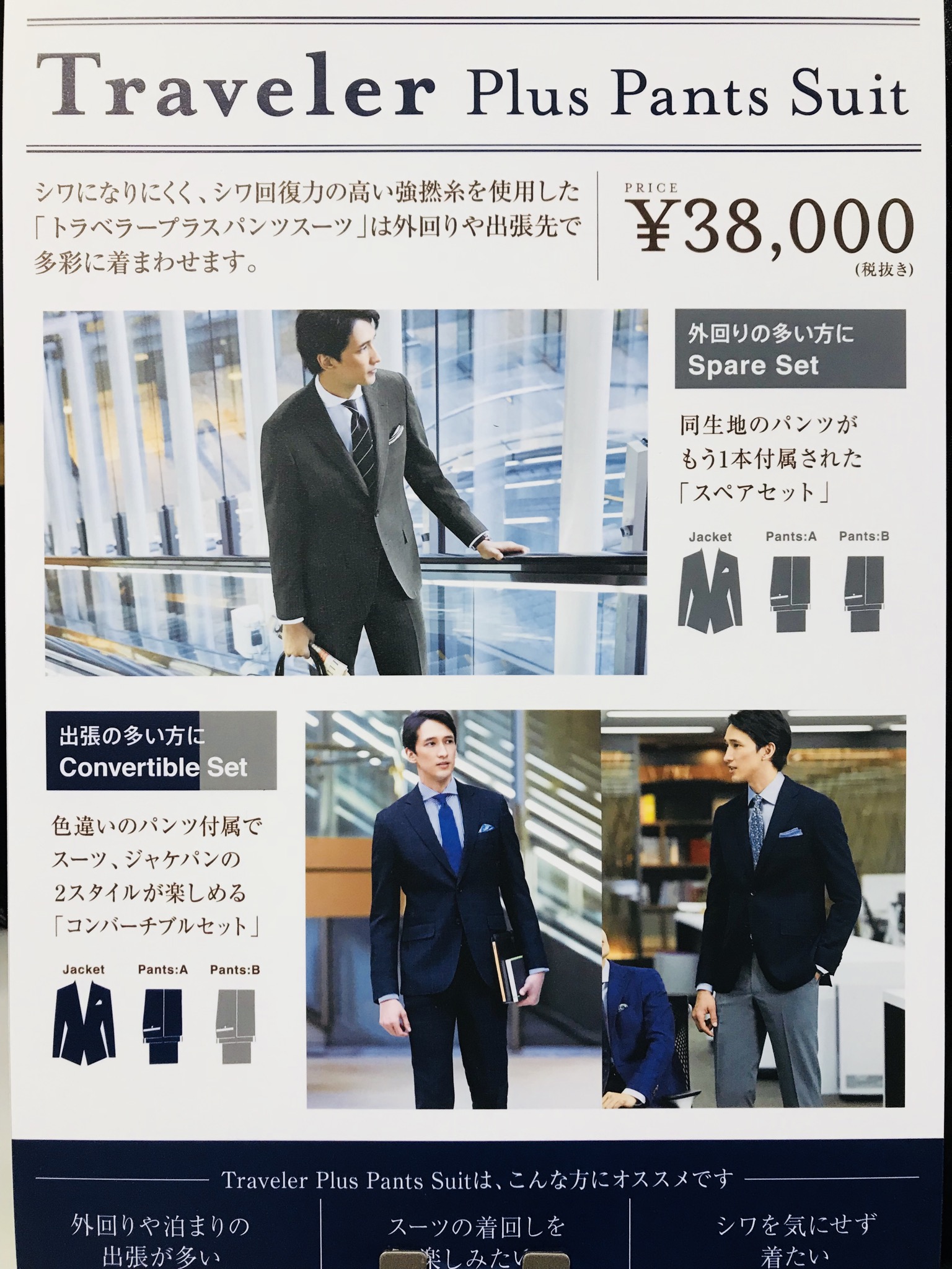 着まわしたい、パンツが2本欲しいという方以外にも「シワに強いスーツが欲しい」という方にも最適です。