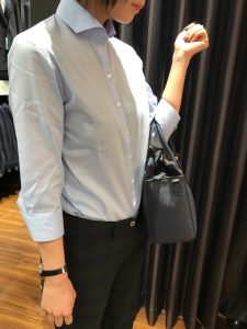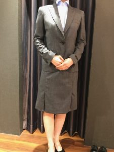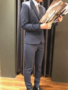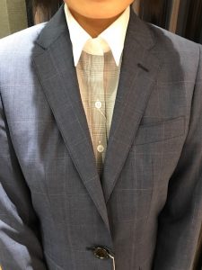 青地で爽やかさを出しつつ、ピンクのウィンドウペンチェック柄で可愛らしさも兼ね備えてるスーツとなってます!今回はシャツをグレーのチェックにして、チェックonチェックでマニッシュにしました♪