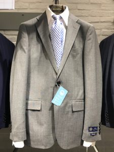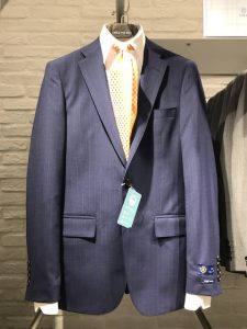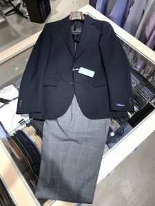 スーツはカラーストライプの入った、飽きのこないブルーとグレー。