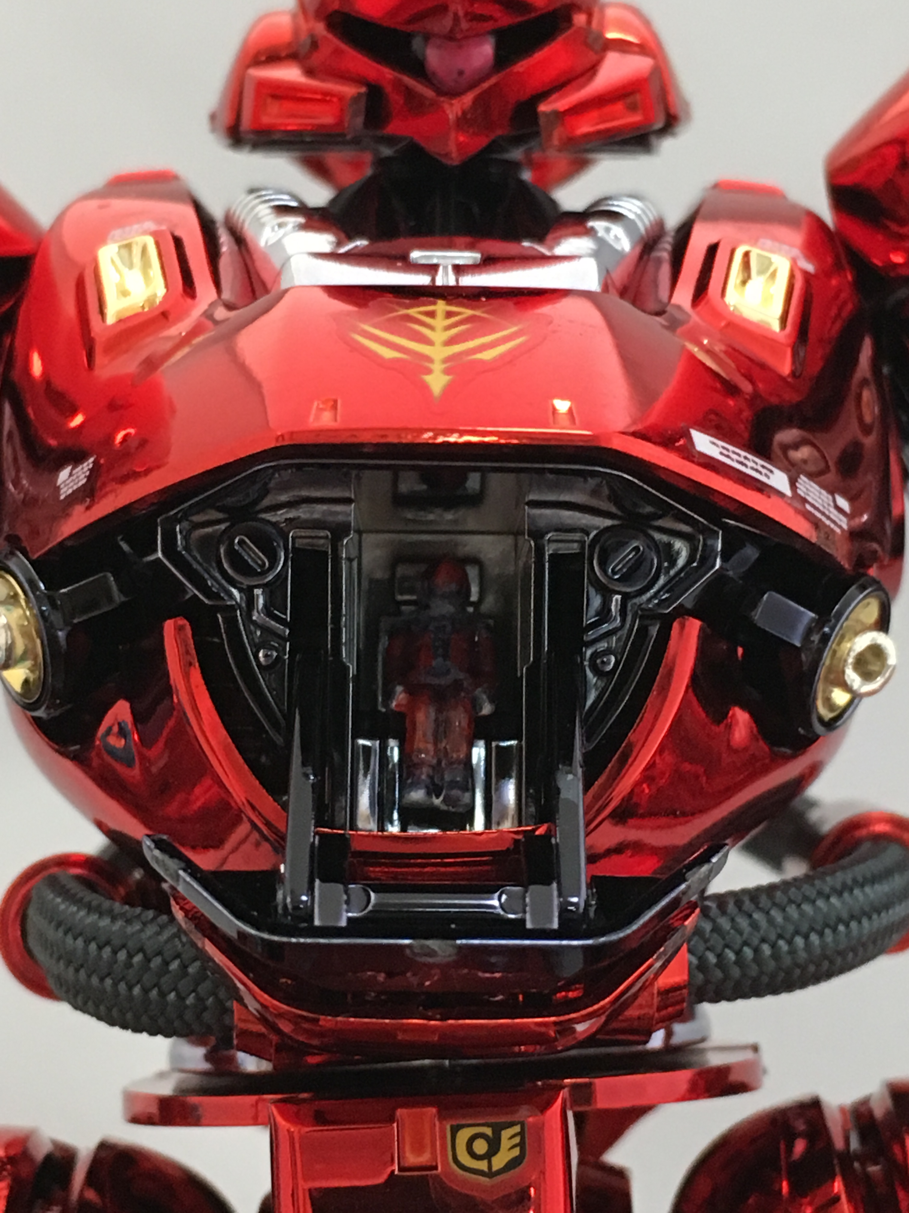 塗装は真空蒸着メッキをプロの業者さんに依頼したものを組立、各バーニア、武器にメタルパーツを追加してディテールアップ、水転写デカールを使用して情報量を増し、パイロットは筆塗りで細かく色分けしています。