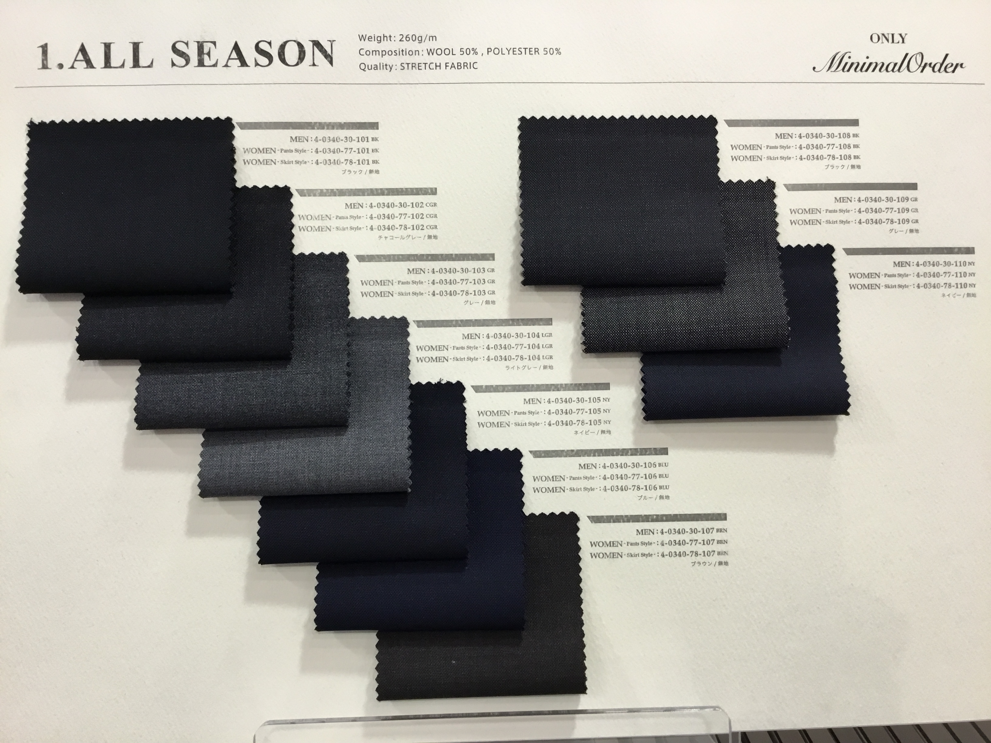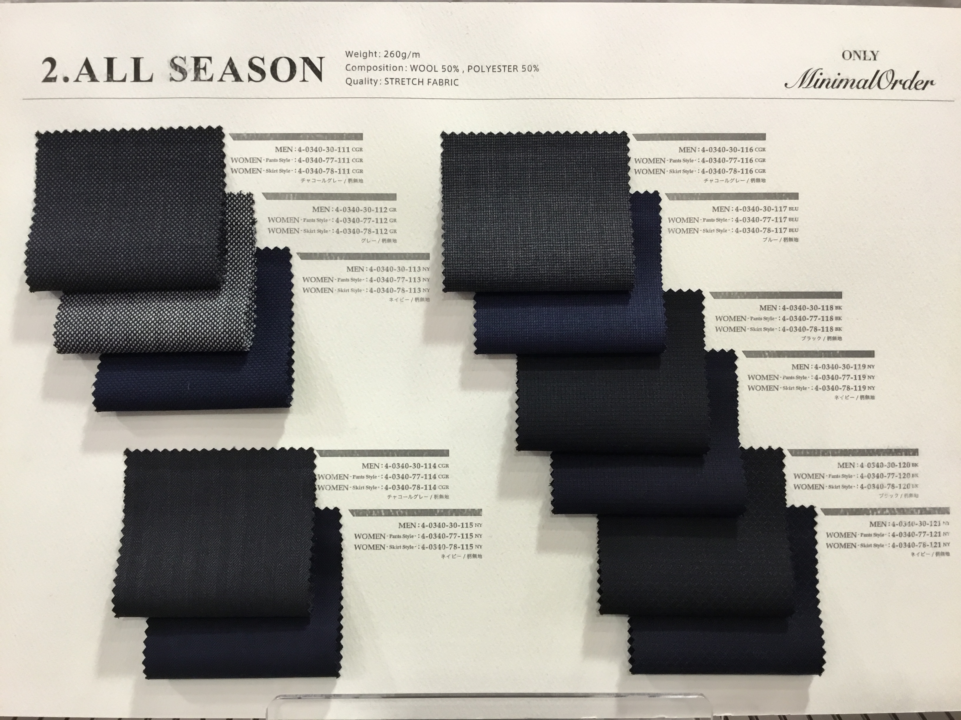 定番のネイビー、ブラック、チャコールグレーはもちろん、ブライダルにも最適な光沢の美しい生地も取り揃えており、幅広いニーズにお応えできるラインナップです。