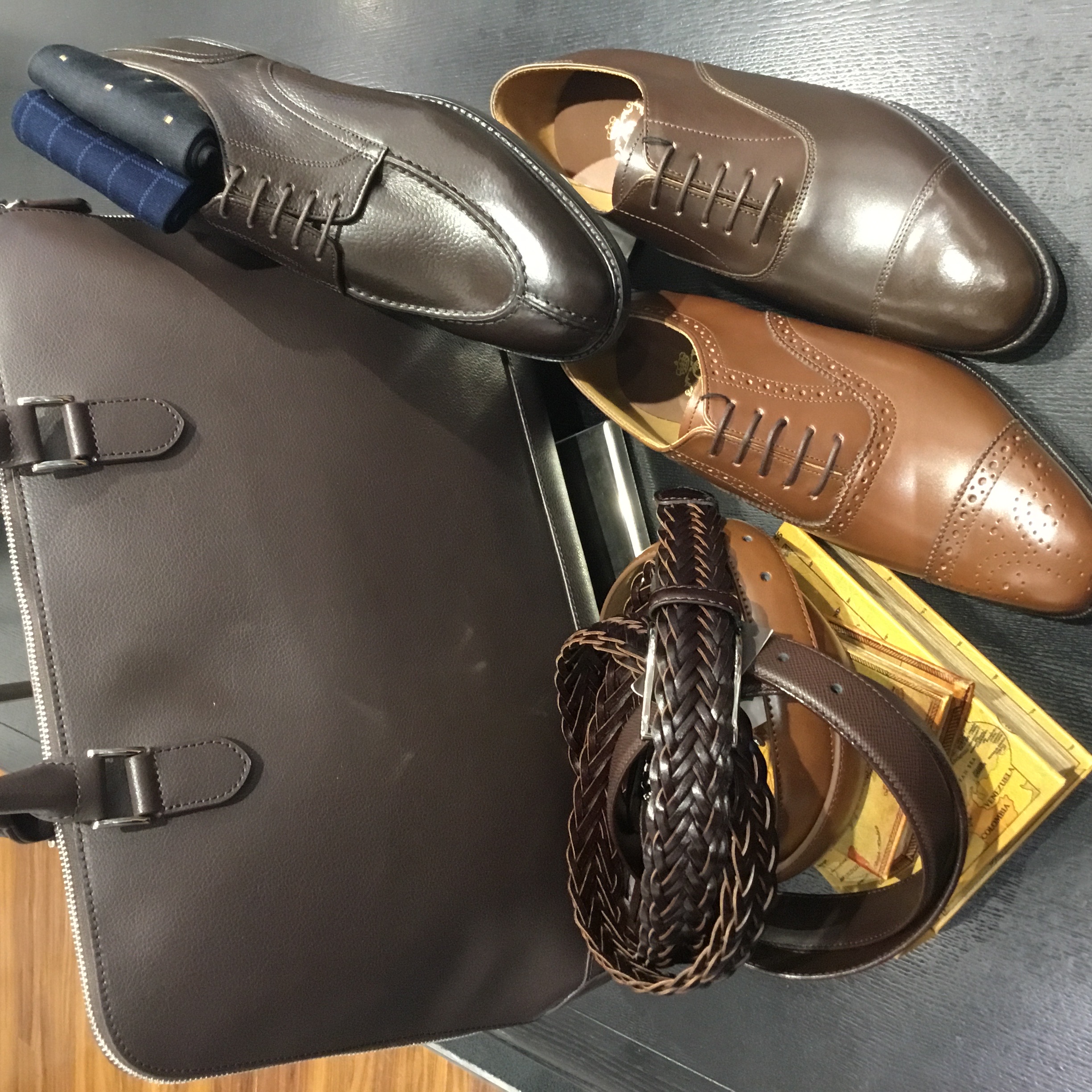 そこで、着こなしのポイントにブラウンの革小物。