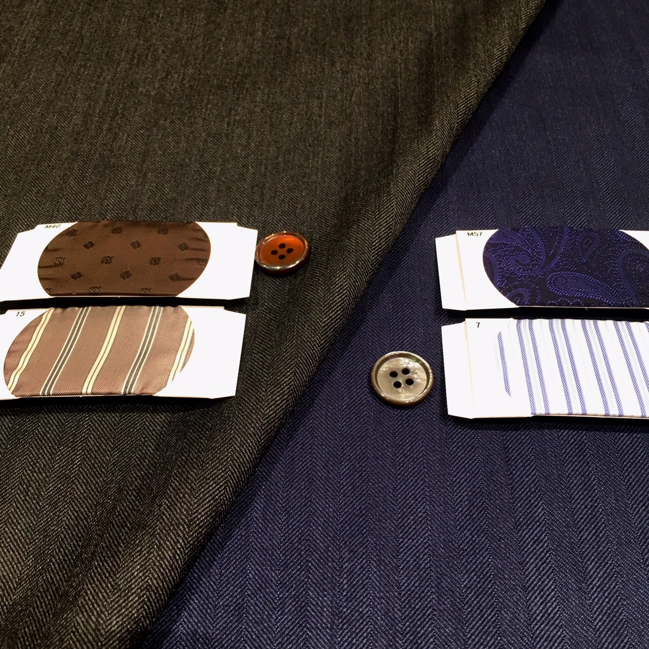 裏地は生地の雰囲気を損ねないようブラウンとネイビーで統一。ボタンに関しても生地の光沢感とバランスの良いシェルをオススメさせていただきます。