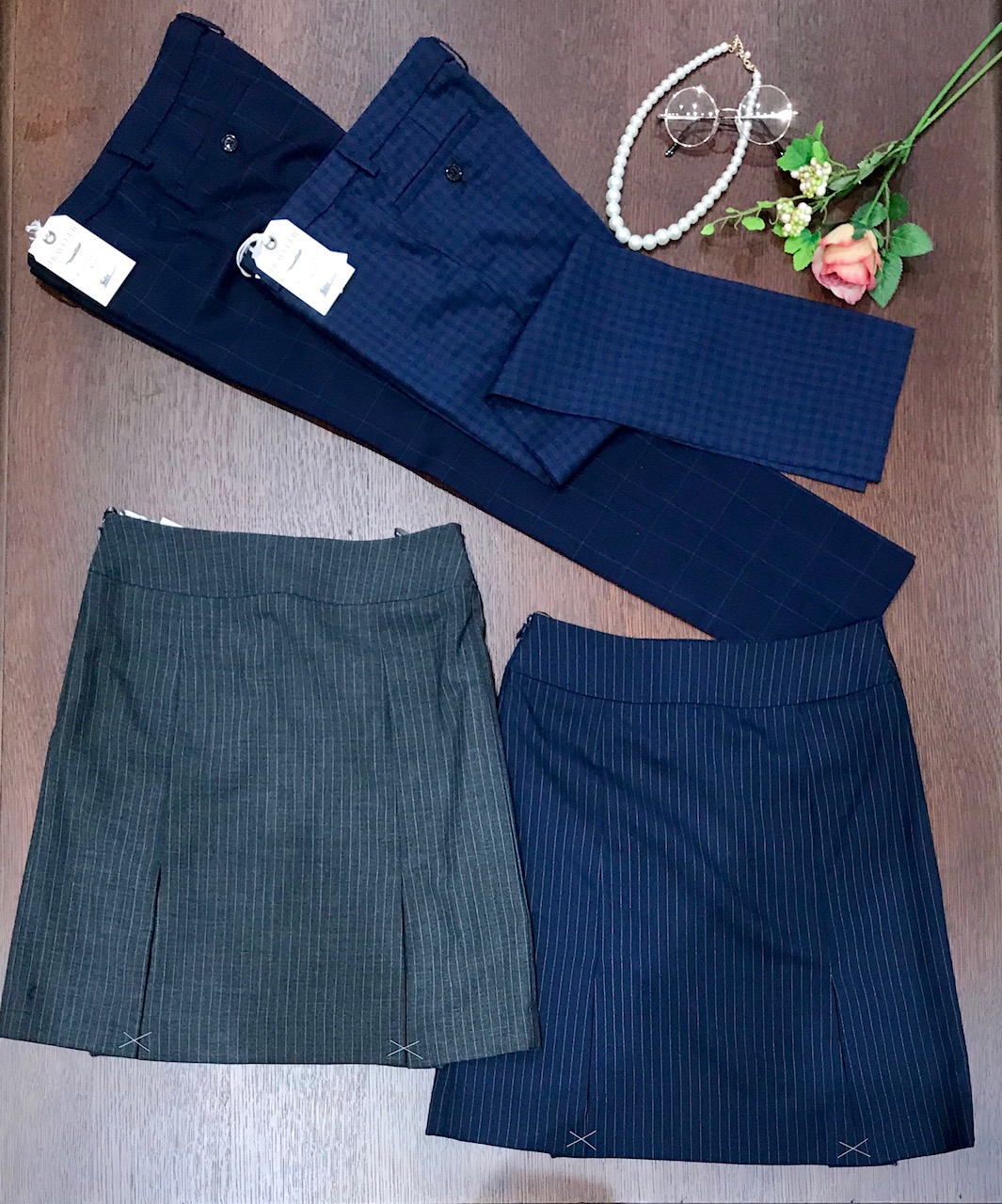ジャケットは背抜き使用。ボトムスは人気のクロップドパンツ・動きやすさと華やかさを兼ね備えたボックスプリーツスカート。単品使いもしやすいのでクールビズの今の時期から揃えたいですね♪クロップドパンツはお直し不要で細身のストレートパンツとしてもお使い頂けます。(スタッフはくるぶしまでしっかり出したいので長さをお直しして着用することの方が多いです♪)