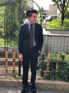 ブルーシャツと紺スーツスタイルですので、茶色のネクタイで引き締めを。