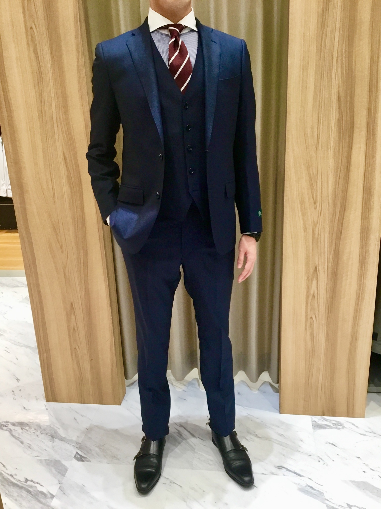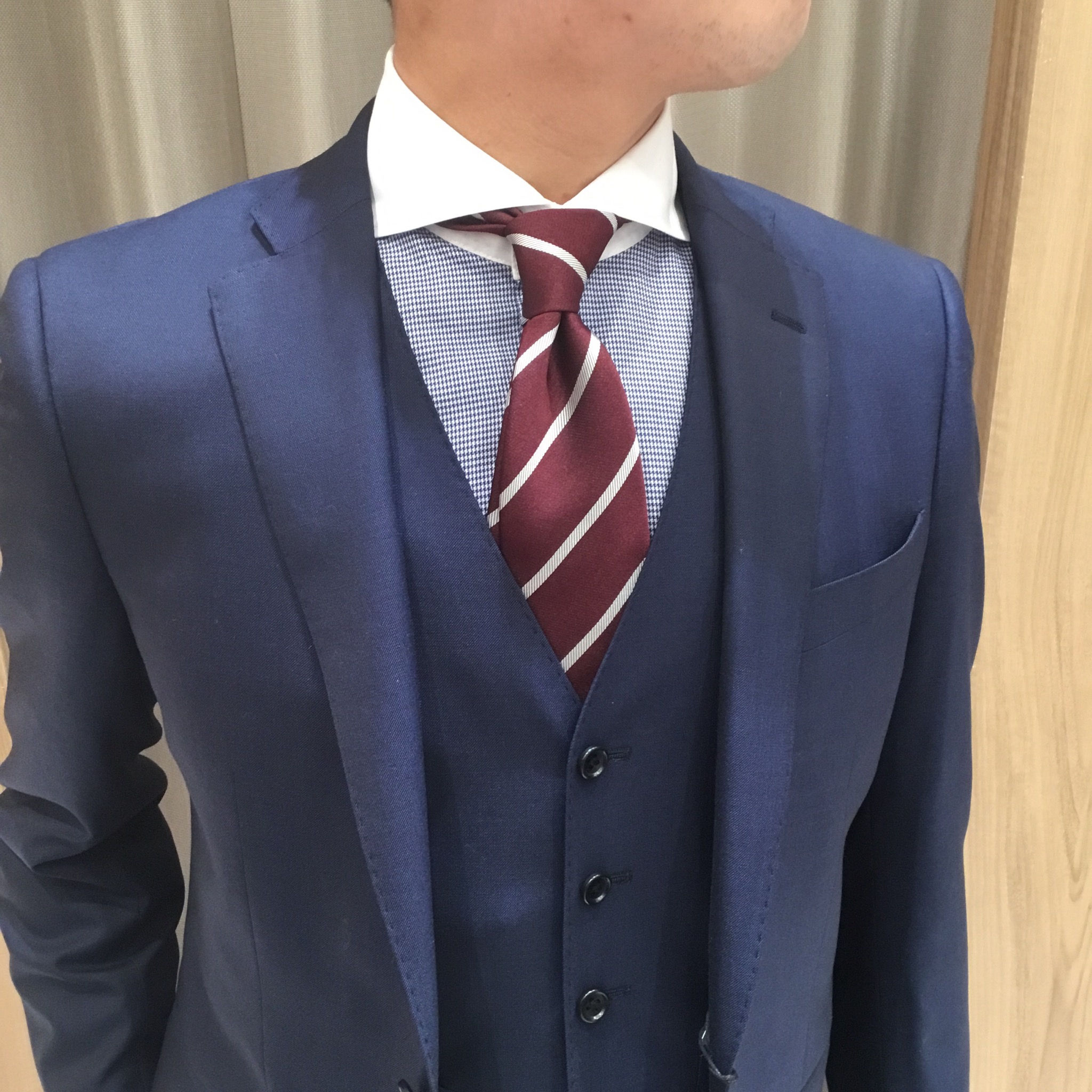 ★シルク混 3ピーススーツ ¥38,000(税抜き) ネイビー/柄無地