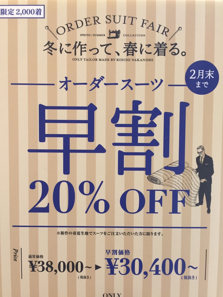 ONLYでは、自社工場の閑散期にご注文いただくことで、オーダースーツが20%オフになる唯一のお値引き企画となっております。