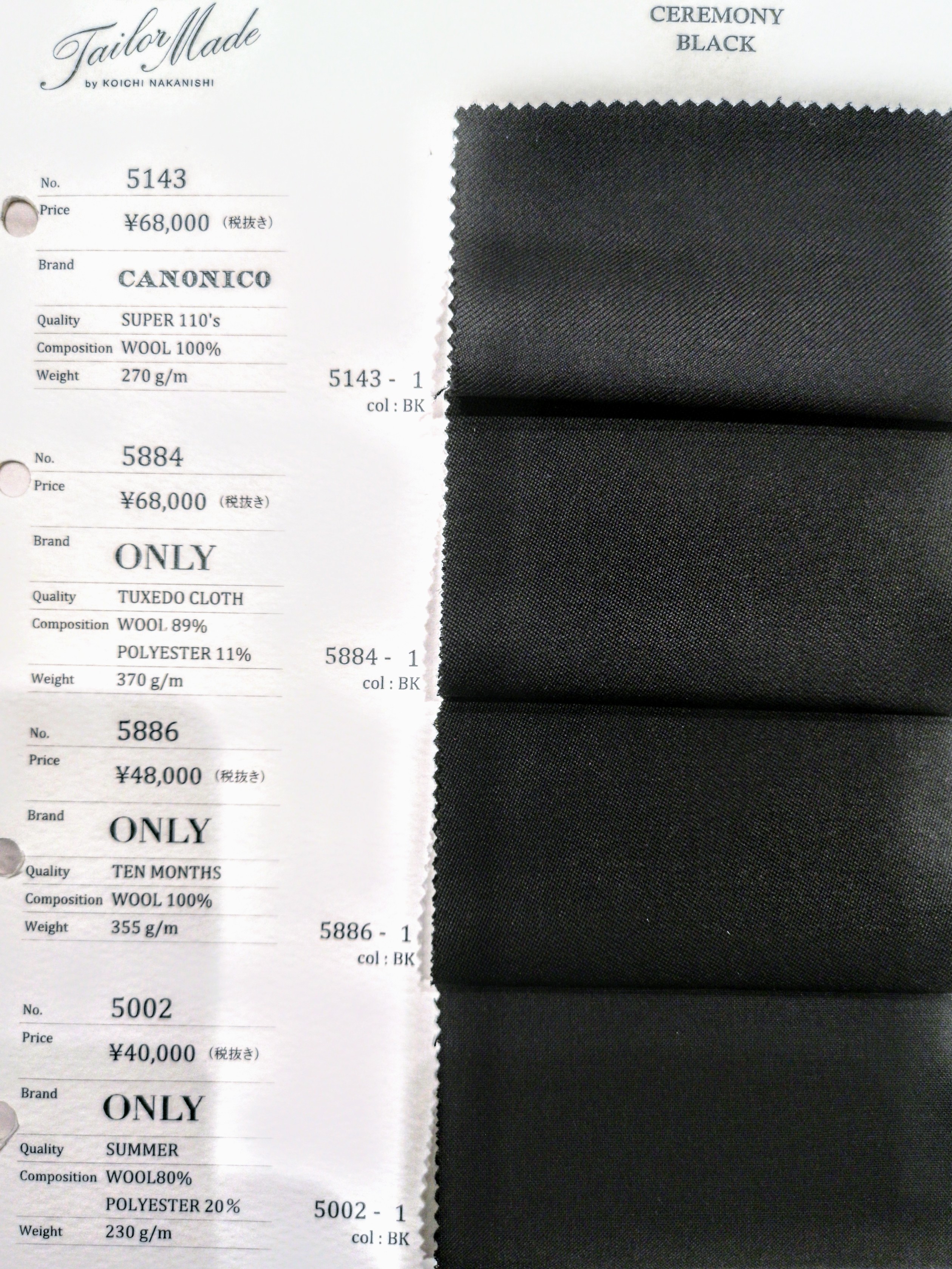 ウール100%でスーパー110とバランスのよいインポート生地をはじめ、ドレッシーなタキシードクロスの生地、季節問わず着れるテンマンスの生地、更には、夏場でも涼しいサマーの生地、と豊富にご用意しております。