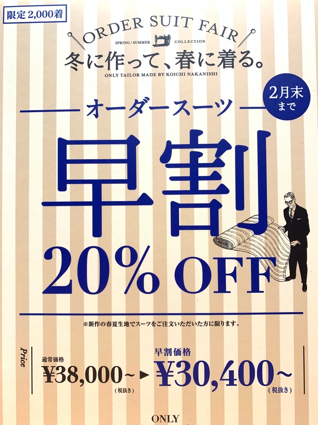 ONLYのオーダースーツを20%OFFで作れるのは早割だけです。