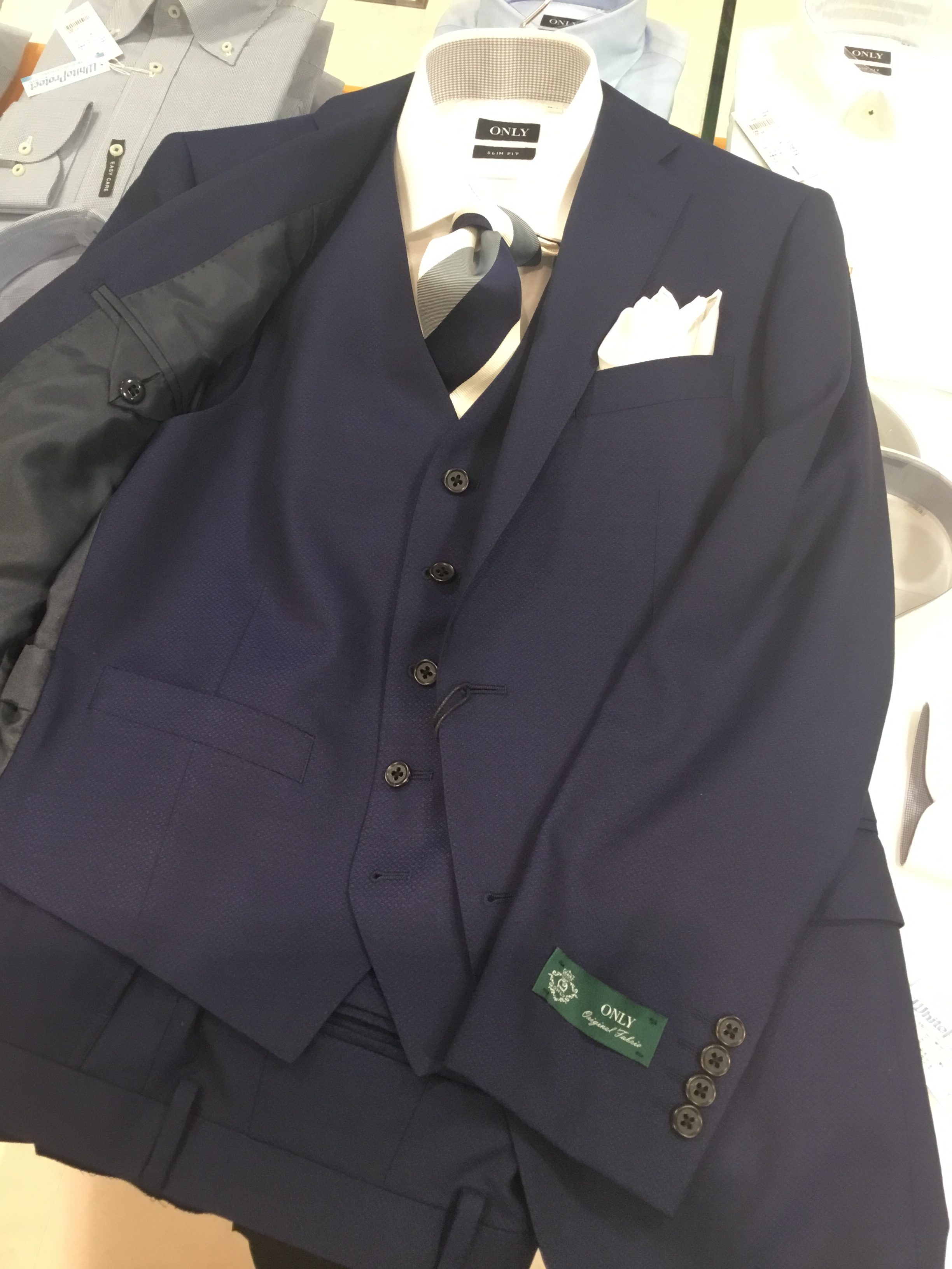 1,爽やかなネイビーのスリーピーススーツスタイル! 価格¥38,000(税抜き)