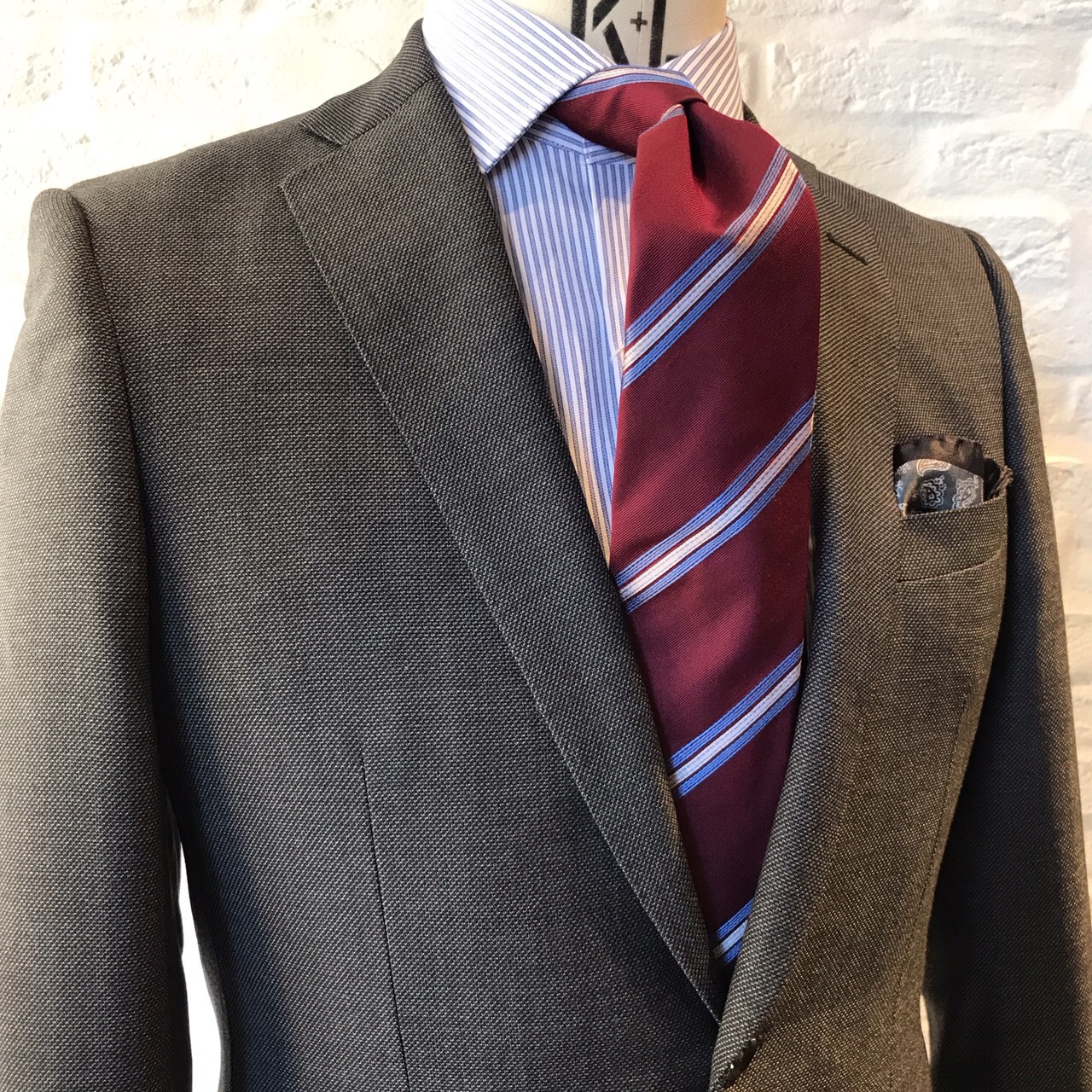 シックなグレースーツにはブルーのストライプシャツ明るめ赤のネクタイでVゾーンをインパクト