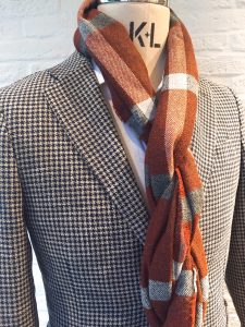 白シャツに千鳥格子のジャケットできっちり感オレンジのストールでやわらか感モテモテコーデ