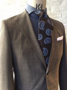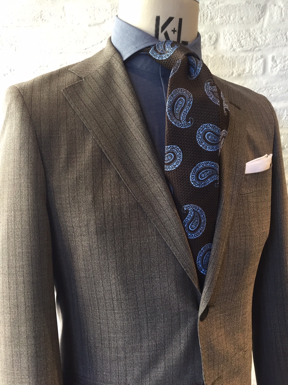 ブラウンストライプスーツには存在感のあるブラウンペイズリータイで大人な装いを演出