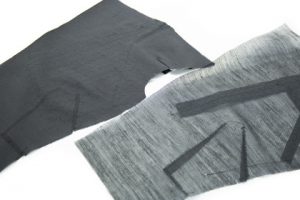 生地口の粗い、絡み織りと呼ばれる方法で製織した一枚の薄い布地に樹脂を塗布した超軽量芯地の開発に成功。